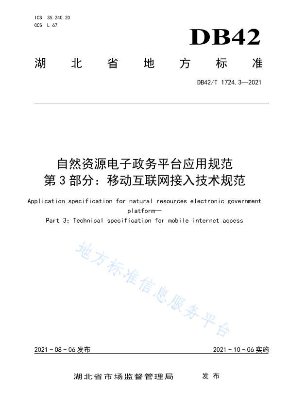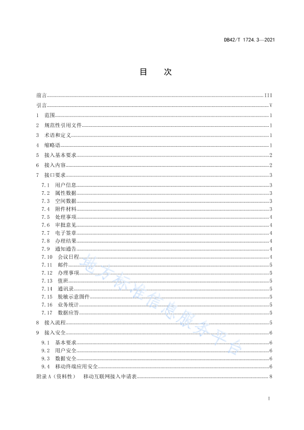 本文件按照GB/T 1. 1-2020《标准化工作导则第1部分: 标准化文件的结构和起草规则》的规定起草. 本文件是DB42/T 1724 《自然资源电子政务平台应用规范》的第3部分。DB42/T 1724已经发布了以下部分: -第1部分:电子公文交换技术规范; -第2部分:行政服务工作流接口技术规范; -第3部分:移动互联网接入技术规范。 请注意本文件的某些内容可能涉及专利。本文件的发布机构不承担识别专利的责任。 本文件由湖北省自然资源厅信息中心提出。 本文件由湖北省自然资源厅归口。 本文件起草单位:湖北省自然资源厅信息中心、苍穹数码技术股份有限公司、湖北省标准化与质量研究院、武汉大学、武汉蚁图时空科技有限公司。 本文件主要起草人:李江、陈安怀、朱峰、陈磊、华振楠、康维、汤梦霞、李张顺、吴华意、李锐、潘朋成、王涛。 本文件实施应用中的疑问,可咨询湖北省自然资源厅,联系电话: 027-86656061;对本文件的有关修改意见建议请反馈至湖北省自然资源厅信息中心,联系电话: 027-86656 123.