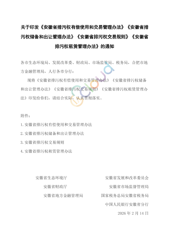 各市生态环境局、发展改革委、财政局、市场监管局、税务局,合肥市地方金融管理局,人行各市分行: 现将《安徽省排污权有偿使用和交易管理办法》《安徽省排污权储备和出让管理办法》《安徽省排污权交易规则》《安徽省排污权租赁管理办法》印发给你们,请结合实际,认真贯彻落实。 附件: 1.安徽省排污权有偿使用和交易管理办法 2.安徽省排污权储备和出让管理办法 3.安徽省排污权交易规则 4.安徽省排污权租赁管理办法 安徽省生态环境厅 安徽省发展和改革委员会 安徽省财政厅 安徽省市场监督管理局 安徽省地方金融管理局 国家税务总局安徽省税务局 中国人民银行安徽省分行 2026年2月14日