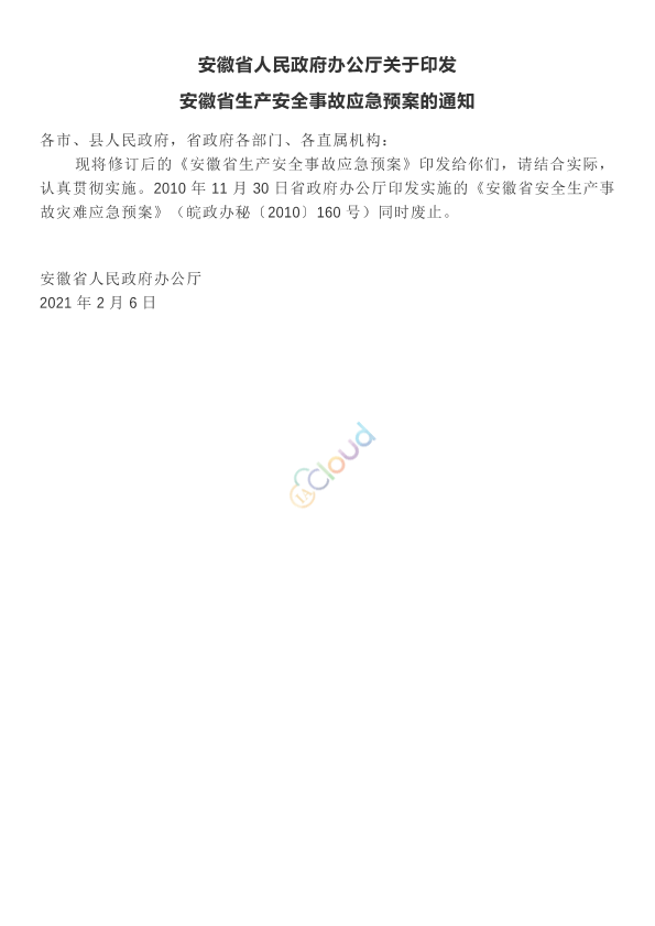 各市、县人民政府,省政府各部门、各直属机构: 现将修订后的《安徽省生产安全事故应急预案》印发给你们,请结合实际,认真贯彻实施。2010年11月30日省政府办公厅印发实施的《安徽省安全生产事故灾难应急预案》(皖政办秘〔2010〕160号)同时废止。 安徽省人民政府办公厅 2021年2月6日