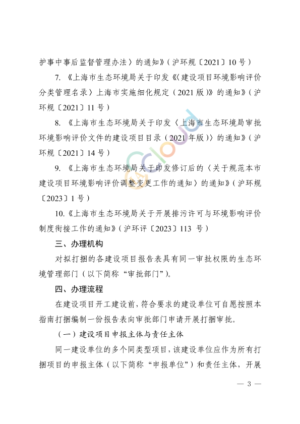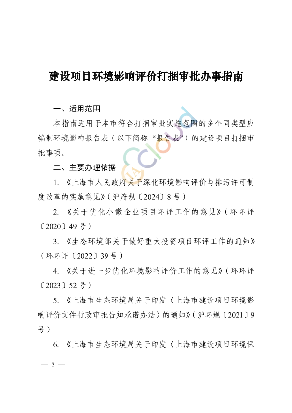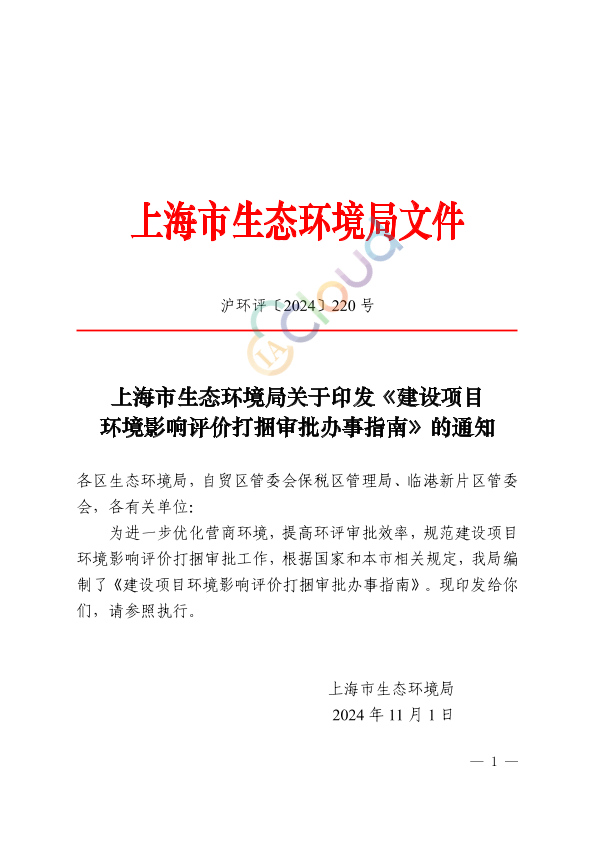 各区生态环境局,自贸区管委会保税区管理局、临港新片区管委会,各有关单位: 为进一步优化营商环境,提高环评审批效率,规范建设项目环境影响评价打捆审批工作,根据国家和本市相关规定,我局编制了《建设项目环境影响评价打捆审批办事指南》。现印发给你们,请参照执行。 上海市生态环境局 2024 年11月1日