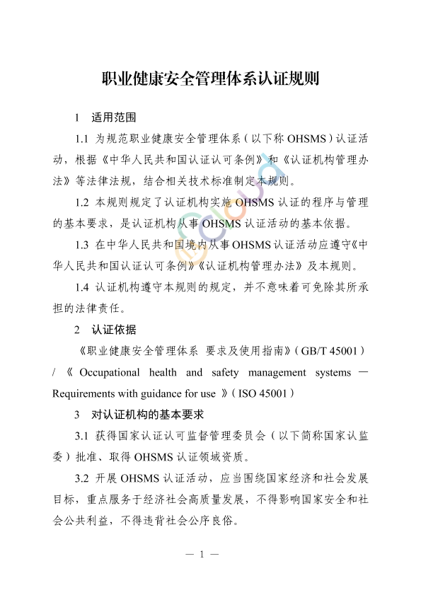 1.1 为规范职业健康安全管理体系(以下称 OHSMS)认证活动,根据《中华人民共和国认证认可条例》和《认证机构管理办法》等法律法规,结合相关技术标准制定本规则。 1.2 本规则规定了认证机构实施 OHSMS 认证的程序与管理的基本要求,是认证机构从事 OHSMS 认证活动的基本依据。 1.3 在中华人民共和国境内从事OHSMS认证活动应遵守《中华人民共和国认证认可条例》《认证机构管理办法》及本规则。 1.4 认证机构遵守本规则的规定,并不意味着可免除其所承担的法律责任。