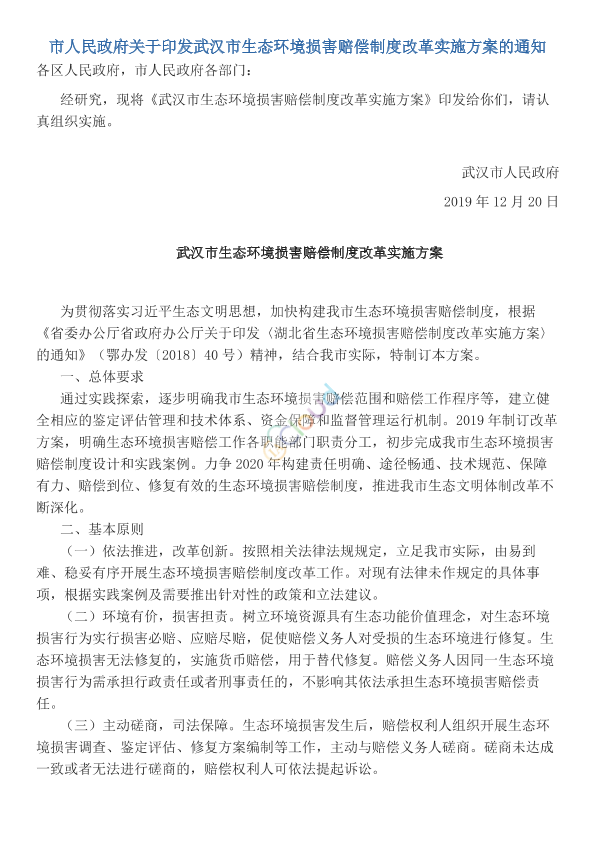 各区人民政府,市人民政府各部门: 经研究,现将《武汉市生态环境损害赔偿制度改革实施方案》印发给你们,请认真组织实施。 武汉市人民政府 2019年12月20日