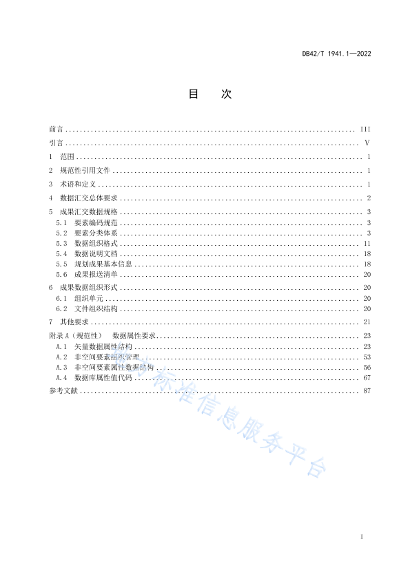 本文件按照GB/T 1.1- 2020《标准化工作导则第1部分: 标准化文件的结构和起草规则》的规定起草。 本文件为DB42/T 1941《湖北省市县级国土空间总体规划数据库技术规范》的第1部分。DB42/T 1941 已经发布了以下部分: -第1部分: 汇交要求; -第2部分:质量检查细则。 请注意本文件的某些内容可能涉及专利。本文件的发布机构不承担识别专利的责任。 本文件由湖北省自然资源厅信息中心提出。 本文件由湖北省自然资源厅归口。 本文件起草单位:湖北省自然资源厅信息中心、湖北省自然资源厅国土空间规划处、湖北省自然资源厅信息化处、湖北省空间规划研究院、中国地质大学(武汉)、吉奥时空信息技术股份有限公司、湖北省规划设计研究总院有限责任公司、湖北省标准化与质量研究院。 本文件主要起草人:李强、喻力、黄婷、傅文豪、陈莹莹、陶文铸、严山艾、徐雯、叶锐、徐玉红、郑丽娜、周安发、李江、张冬梅、吴益平、金群、王韦、余恒、史乘、林洋、王平、杜大雾、王清、陈磊、康维。 本文件实施应用中的疑问,可咨询湖北省自然资源厅,联系电话: 027-86656061, 邮箱: 102687929@qqa.com;对本文件的有关修改意见和建议请反馈至湖北省自然资源厅信息中心,联系电话:027-86656123,邮箱: 649448576@qq. com。