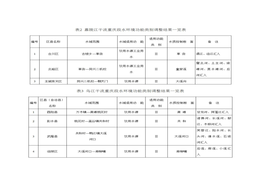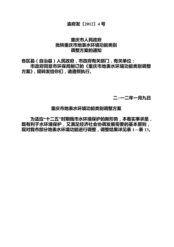 各区县(自治县)人民政府,市政府有关部门,有关单位: 市政府同意市环保局制订的《重庆市地表水环境功能类别调整方案》,现转发给你们,请遵照执行。 二0一二年一月九日