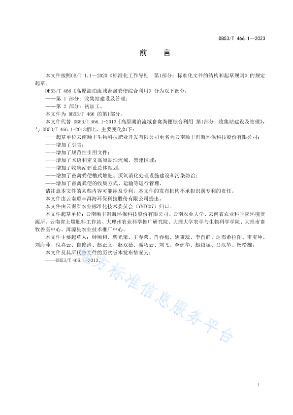 本文件按照GB/T 1.1—2020《标准化工作导则 第1部分:标准化文件的结构和起草规则》的规定起草。 DB53/T 466《高原湖泊流域畜禽粪便综合利用》分为以下部分: ——第 1 部分:收集站建设及管理; ——第 2 部分:初加工。 本文件为 DB53/T 466 的第1部分。 请注意本文件的某些内容可能涉及专利。本文件的发布机构不承担识别专利的责任。 本文件由云南顺丰洱海环保科技股份有限公司提出。