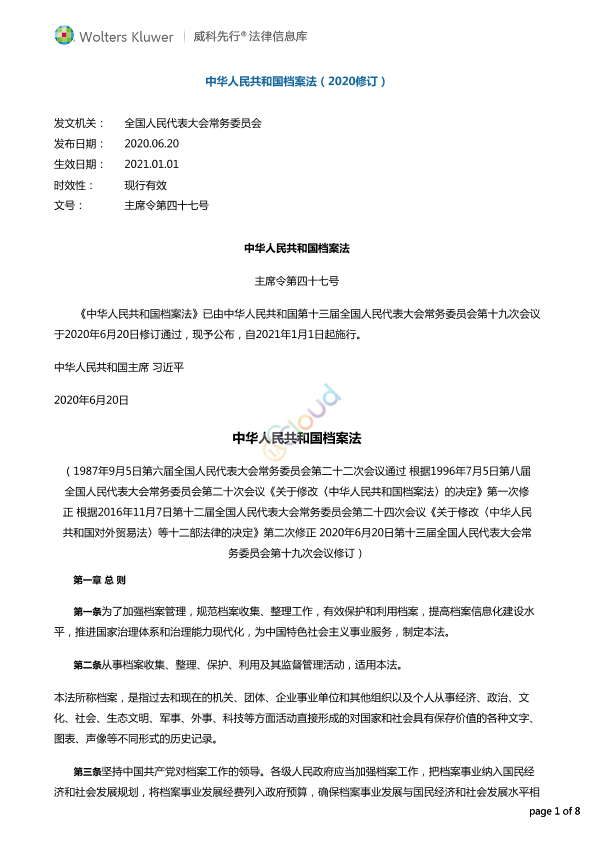 《中华人民共和国档案法》已由中华人民共和国第十三届全国人民代表大会常务委员会第十九次会议于2020年6月20日修订通过,现予公布,自2021年1月1日起施行。 中华人民共和国主席 习近平 2020年6月20日
