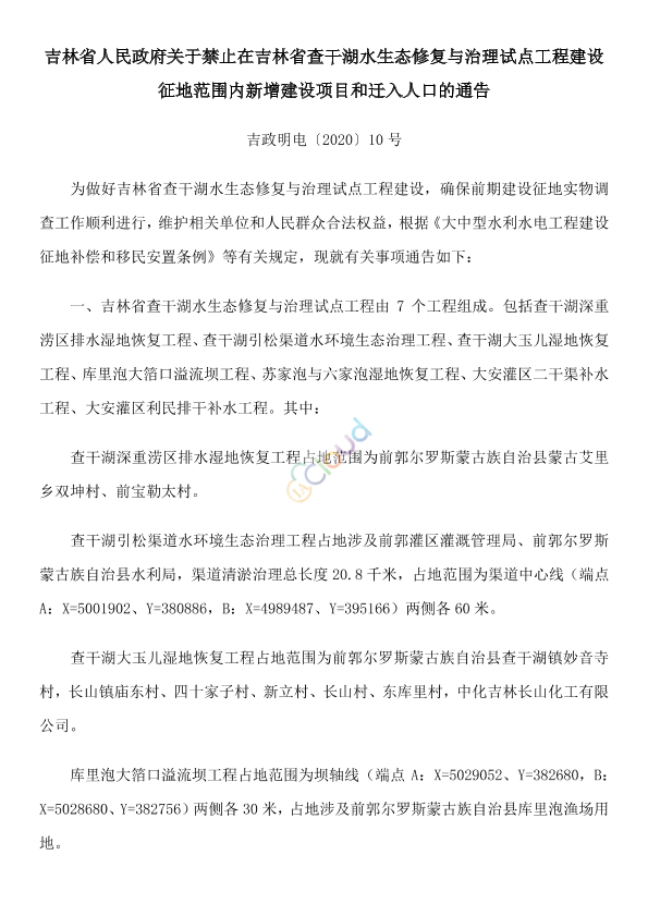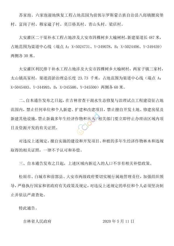 为做好吉林省查干湖水生态修复与治理试点工程建设,确保前期建设征地实物调查工作顺利进行,维护相关单位和人民群众合法权益,根据《大中型水利水电工程建设征地补偿和移民安置条例》等有关规定,现就有关事项通告如下: