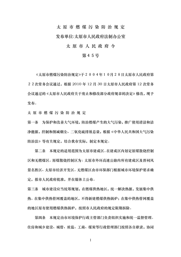 《太原市燃煤污染防治规定》于2004年10月28日太原市人民政府第22次常务会议通过,根据 2010 年 12 月 30 日太原市人民政府第 12 次常务会议通过的《太原市人民政府关于废止和修改部分政府规章的决定》修改,现予发布。