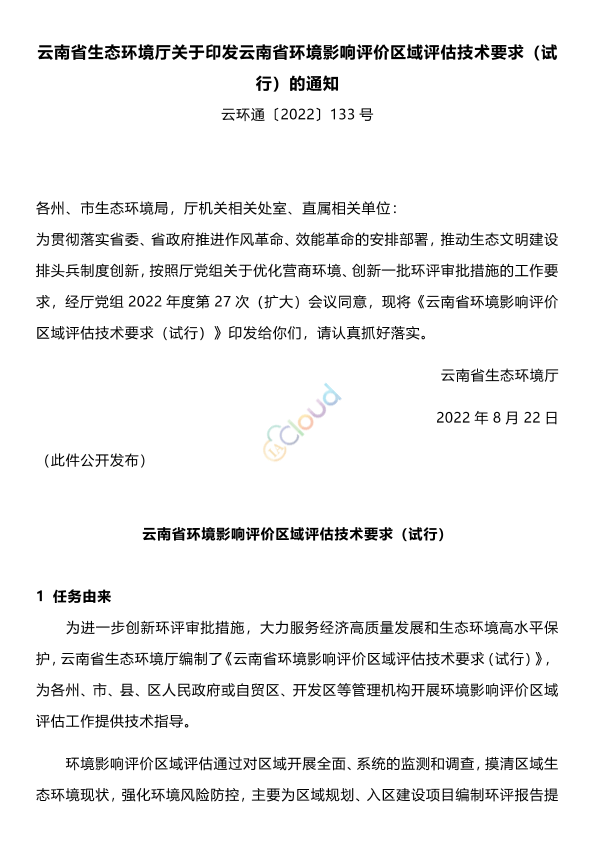 各州、市生态环境局,厅机关相关处室、直属相关单位: 为贯彻落实省委、省政府推进作风革命、效能革命的安排部署,推动生态文明建设排头兵制度创新,按照厅党组关于优化营商环境、创新一批环评审批措施的工作要求,经厅党组2022年度第27次(扩大)会议同意,现将《云南省环境影响评价区域评估技术要求(试行)》印发给你们,请认真抓好落实。 云南省生态环境厅 2022年8月22日