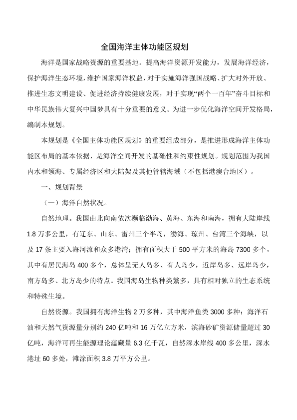 各省、自治区、直辖市人民政府,国务院各部委、各直属机构: 现将《全国海洋主体功能区规划》印发给你们,请认真贯彻执行。 国务院 2015年8月1日