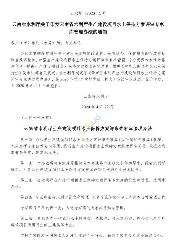 各州(市)水利(水务)局,有关单位: 为认真贯彻落实国务院和省人民政府简政放权、放管结合、优化服务的行政审批制度改革精神,加强生产建设项目水土保持方案评审专家库管理,充分发挥专家技术咨询作用,提高生产建设项目水土保持方案技术评审质量,根据《中华人民共和国水土保持法》及水利部有关规定,省水利厅制定了《云南省水利厅生产建设项目水土保持方案评审专家库管理办法》,经2020年第17次厅党组(扩大)会议审议通过,现予印发,自2020年6月1日起施行。 云南省水利厅 2020年4月22日
