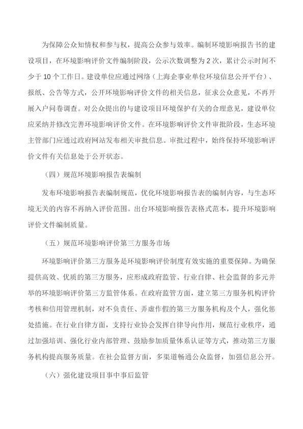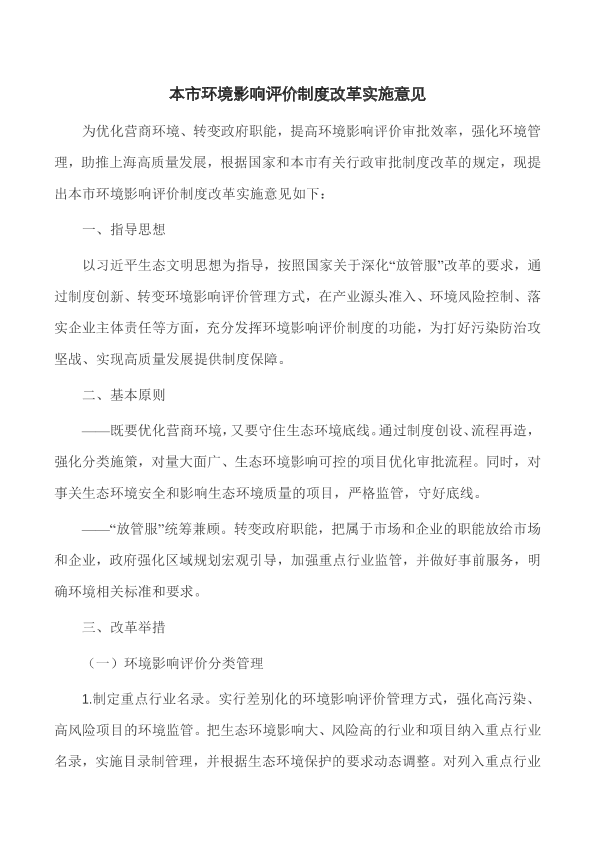 各区人民政府,市政府各委、办、局: 现将《本市环境影响评价制度改革实施意见》印发给你们,请认真按照执行。 上海市人民政府 2019年4月30日