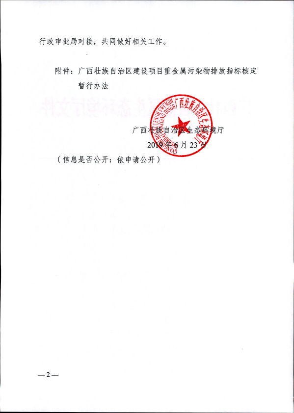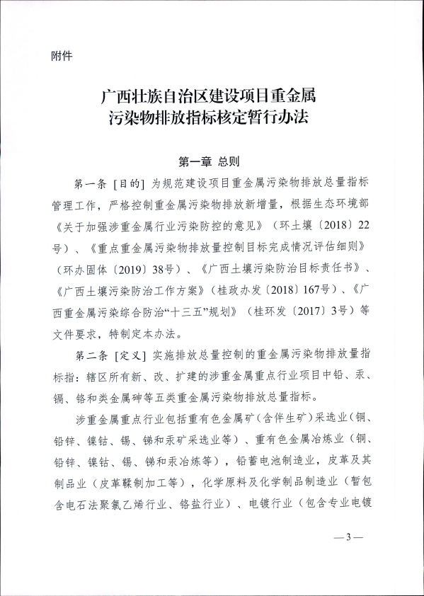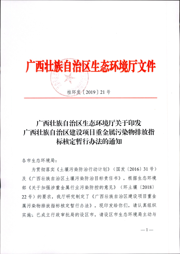 各市生态环境局: 为贯彻落实《土壤污染防治行动计划》(国发〔2016) 31 号)及《广西壮族自治区土壤污染防治目标责任书》,根据生态环境部《关于加强涉重金属行业污染防控的意见》 (环土壤〔2018)22 号)的要求,我厅研究制定了 《广西壮族自治区建设项目重金属污染物排放指标核定暂行办法》,现印发给你们,请认真组织实施乞已成立行政审批局的设区市,请设区市生态环境局主动与行政审批局对接,共同做好相关工作。 附件:广西壮族自治区建设项目重金属污染物排放指标核定暂行办法 广西壮族自治区生态环境厅 2019年6月23日