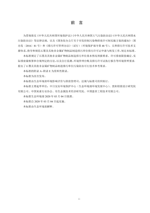 为贯彻落实《中华人民共和国环境保护法》《中华人民共和国大气污染防治法》《中华人民共和国水 污染防治法》等法律法规,以及《国务院办公厅关于印发控制污染物排放许可制实施方案的通知》(国 办发〔2016〕81 号)和《排污许可管理办法》(试行)(环境保护部令第 48 号),完善排污许可技术支 撑体系,指导和规范石墨及其他非金属矿物制品制造排污单位排污许可证申请与核发工作,制定本标准。 本标准规定了石墨及其他非金属矿物制品制造排污单位基本情况填报要求、许可排放限值确定、实 际排放量核算和合规判定的方法,以及自行监测、环境管理台账及排污许可证执行报告等环境管理要求, 提出了石墨及其他非金属矿物制品制造排污单位污染防治可行技术参考要求。 本标准的附录 A~附录 E 为资料性附录。 本标准为首次发布。 本标准由生态环境部环境影响评价与排放管理司、法规与标准司组织制订。 本标准主要起草单位:中日友好环境保护中心(生态环境部环境发展中心)、贵阳铝镁设计研究院 有限公司、中国炭素行业协会、有色金属技术经济研究院、中国恩菲工程技术有限公司。 本标准生态环境部 2020 年 03 月 04 日批准。 本标准自 2020 年 03 月 04 日起实施。 本标准由生态环境部解释。