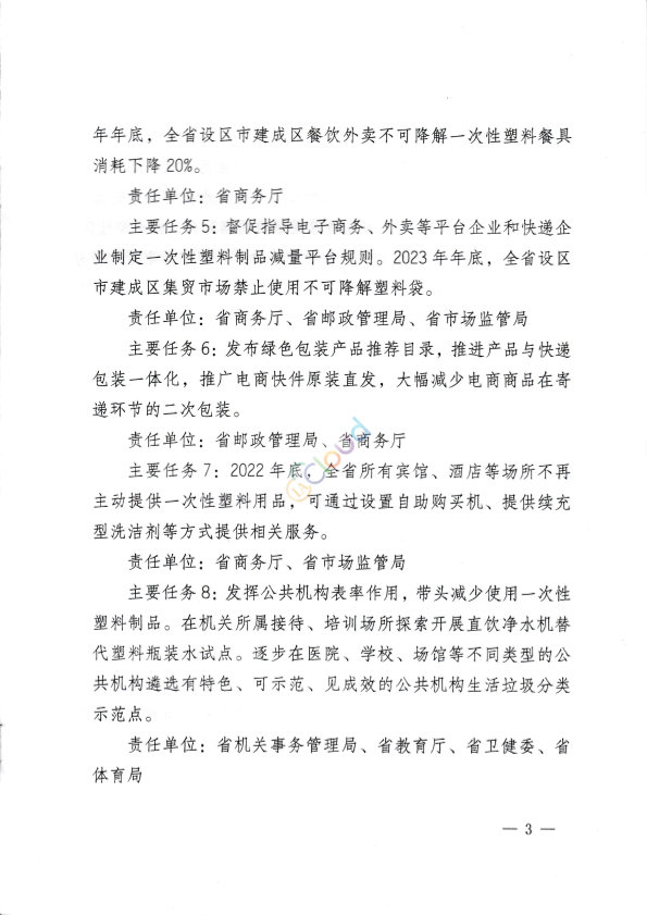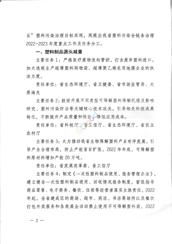 各市发展改革委、生态环境局,省直有关部门: 为认真贯彻落实《国家发展改革委生态环境部关于印发<“十四五”塑料污染治理行动方案>的通知》(发改环资〔2021 ]1298号)和《塑料污染治理2022年工作要点》精神,深入推进《省政府办公厅关于印发山西省加快推进塑料污染治理行动方案的通知》(晋政办发〔2021 ]32号)任务落实,确保“十四五”塑料污染治理目标实现,现提出我省塑料污染全链条治理2022-2023年度重点工作及任务分工。