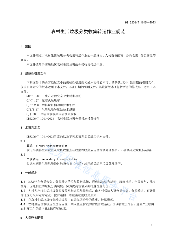 本文件规定了农村生活垃圾分类收集转运作业的一般规定、人员设备配置、分类收集、分类转运等要求。 本文件适用于南通地区农村生活垃圾的分类收集转运作业。