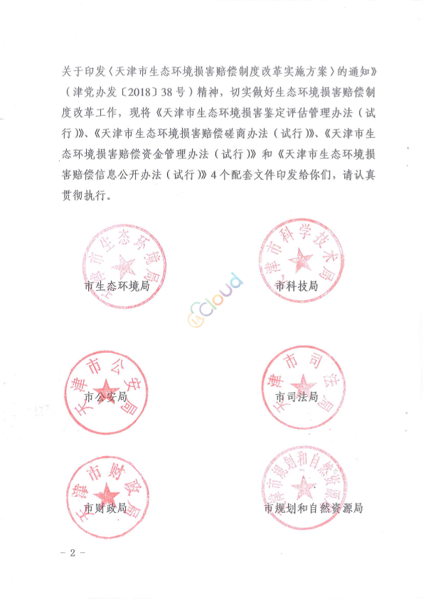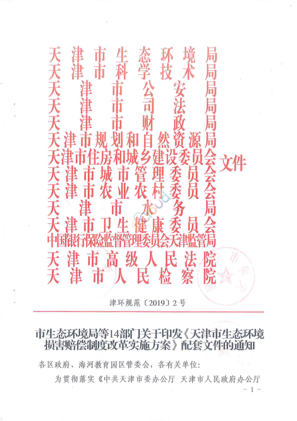 各区政府、海河教育园区管委会,各有关单位: 为贯彻落实《中共天津市委办公厅 天津市人民政府办公厅关于印发〈天津市生态环境损害赔偿制度改革实施方案〉的通知》(津党办发〔2018〕38号)精神,切实做好生态环境损害赔偿制度改革工作,现将《天津市生态环境损害鉴定评估管理办法(试行)》、《天津市生态环境损害赔偿磋商办法(试行)》、《天津市生态环境损害赔偿资金管理办法(试行)》和《天津市生态环境损害赔偿信息公开办法(试行)》4个配套文件印发给你们,请认真贯彻执行。 天津市生态环境局 天津市科学技术局 天津市公安局 天津市司法局 天津市财政局 天津市规划和自然资源局 天津市住房和城乡建设委员会 天津市城市管理委员会 天津市农业农村委员会 天津市水务局 天津市卫生健康委员会 中国银行保险监督管理委员会天津监管局 天津市高级人民法院 天津市人民检察院 2019年2月27日 (此件公开发布) 附件:《天津市生态环境损害赔偿制度改革实施方案》配套文件