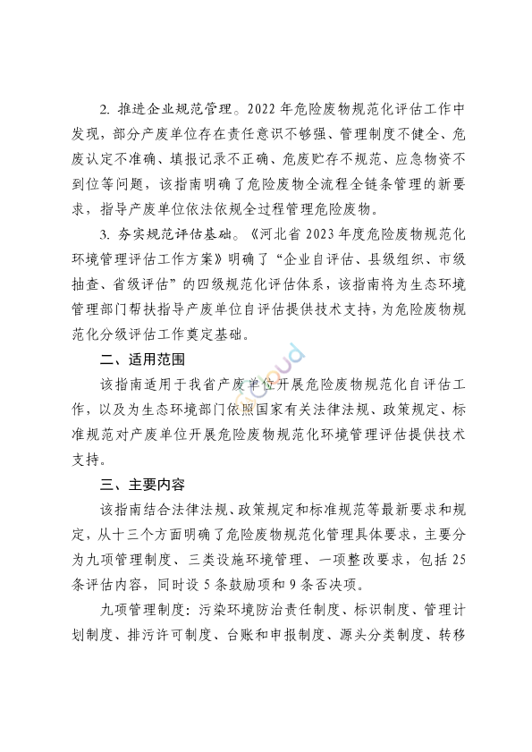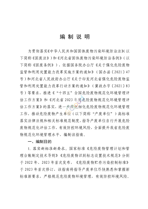 为贯彻落实《中华人民共和国固体废物污染环境防治法》(以下简称《固废法》)和《河北省固体废物污染环境防治条例》(以下简称《固废条例》),依据国务院办公厅《关于强化危险废物监管和利用处置能力改革实施方案的通知》(国办函〔2021〕47号)和河北省人民政府办公厅《关于印发河北省强化危险废物监管和利用处置能力改革行动方案的通知》(冀政办字〔2021〕83号)等要求,推进《“十四五”全国危险废物规范化环境管理评估工作方案》和《河北省2023 年度危险废物规范化环境管理评估工作方案》的落实,进一步深化细化危险废物规范化环境管理工作,推动危险废物产生单位(以下简称“产废单位”)高标准落实法律法规和相关标准规范制度,指导产废单位自行开展危险废物规范化评估工作,有效防控环境风险,全面提升我省危险废物规范化环境管理水平,编制该指南。
