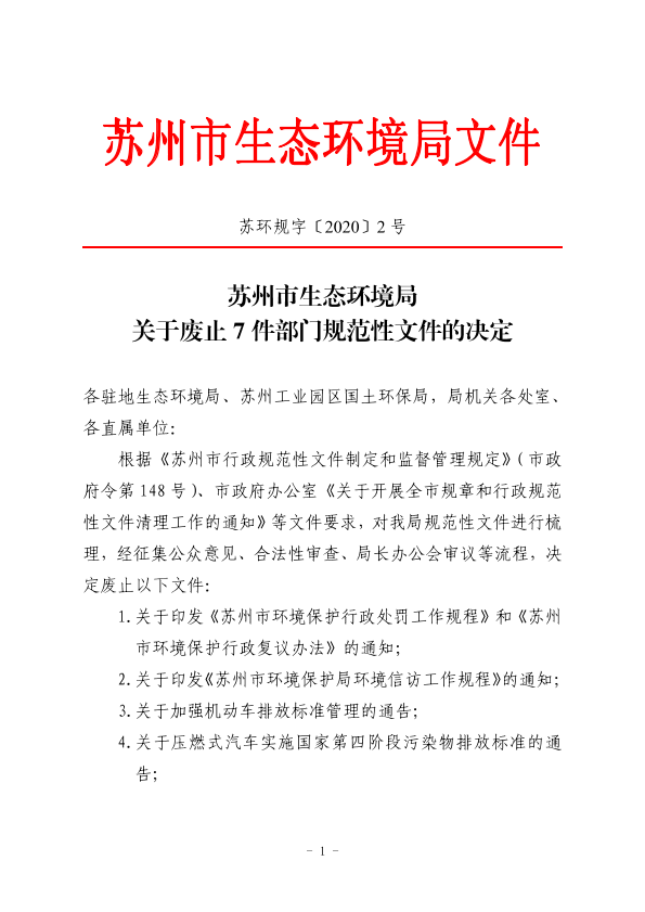 各驻地生态环境局、苏州工业园区国土环保局,局机关各处室、各直属单位: 根据《苏州市行政规范性文件制定和监督管理规定》(市政府令第148 号)、市政府办公室《关于开展全市规章和行政规范性文件清理工作的通知》等文件要求,对我局规范性文件进行梳理,经征集公众意见、合法性审查、局长办公会审议等流程,决定废止以下文件: