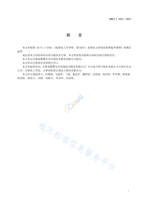 本文件按照 GB/T1.1-2020 《标准化工作导则 第1部分:标准化文件的结构和起草规则》的规定起草。 请注意本文件的某些内容可能涉及专利。本文件的发布机构不承担识别专利的责任。 本文件由吉林省腾翼安全环境技术服务有限公司提出。 本文件由吉林省应急管理厅归口。 本文件起草单位:吉林省腾翼安全环境技术服务有限公司、中石油天然气股份有限公司吉林石化分公司、吉林化工学院、吉林省松原石油化工股份有限公司。 本文件主要起草人:闫慧茹、马恩奎、丁斌、惠彦臣、魏国明、尤智斌、刘庆利、李学增、窦景新、侯宪郓、蒋容方、闫凯、刘新月、李双华、厉冰思。