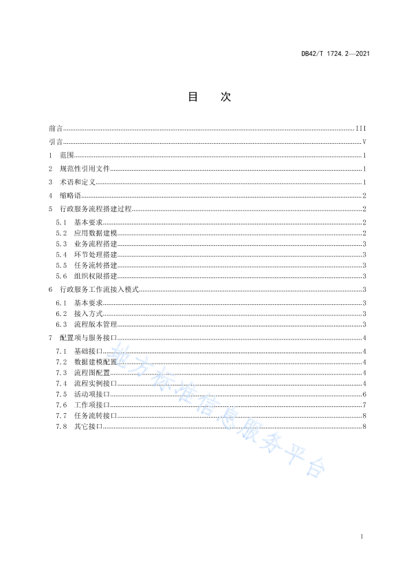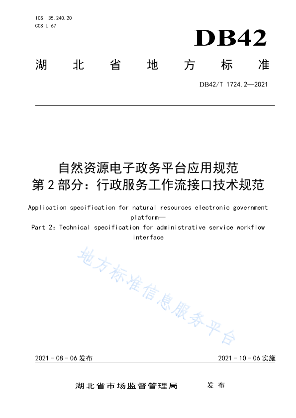 本文件按照GB/T 1. 1-2020《标准化工作导则第1部分:标准化文件的结构和起草规则》的规定起草。 本文件是DB42/T 1724 《自然资源电子政务平台应用规范》的第2部分。DB42/T 1724已经发布了以下部分: -第1部分:电子公文交换技术规范: -第2部分:行政服务工作流接口技术规范; -第3部分:移动互联网接入技术规范。 请注意本文件的某些内容可能涉及专利。本文件的发布机构不承担识别专利的责任。 本文件由湖北省自然资源厅信息中心提出。 本文件由湖北省自然资源厅归口。 本文件起草单位:湖北省自然资源厅信息中心、苍穹数码技术股份有限公司、湖北省标准化与质量研究院、武汉大学、武汉蚁图时空科技有限公司。 本文件主要起草人:李江、陈安怀、潘朋威、吴华意、李锐、陈磊、石莹、朱峰、安娜、张毅、赖云。 本文件实施应用中的疑问,可咨询湖北省自然资源厅,联系电话: 027-86656061:对本文件的有关修改意见建议请反馈至湖北省自然资源厅信息中心,联系电话: 027-86656123.