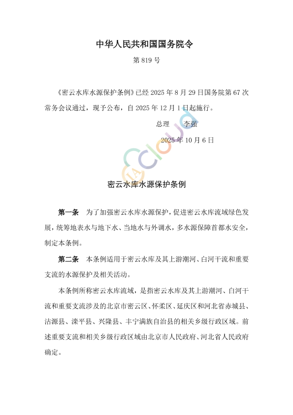《密云水库水源保护条例》已经2025年8月29日国务院第67次常务会议通过,现予公布,自2025年12月1日起施行。 总理 李强 2025年10月6日