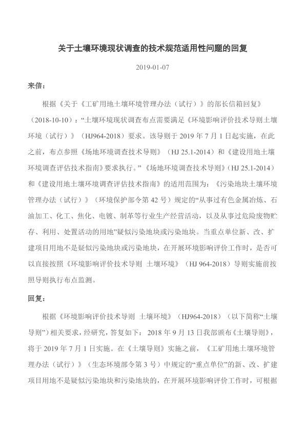 来信: 根据《关于《工矿用地土壤环境管理办法(试行)》的部长信箱回复》(2018-10-10):“土壤环境现状调查布点需要满足《环境影响评价技术导则土壤环境(试行)》(HJ964-2018)要求。该导则于2019年7月1日起实施,在此之前,布点参照《场地环境调查技术导则》(HJ 25.1-2014)和《建设用地土壤环境调查评估技术指南》要求执行。” 《场地环境调查技术导则》(HJ 25.1-2014)和《建设用地土壤环境调查评估技术指南》的适用范围为:《污染地块土壤环境管理办法(试行)》(环境保护部令第42号)规定的“从事过有色金属冶炼、石油加工、化工、焦化、电镀、制革等行业生产经营活动,以及从事过危险废物贮存、利用、处置活动的用地”疑似污染地块或污染地块。当重点单位新、改、扩建项目用地不是疑似污染地块或污染地块,在开展环境影响评价工作时,是否可以直接按照《环境影响评价技术导则 土壤环境》(HJ 964-2018)导则实施前按照导则执行布点监测。
