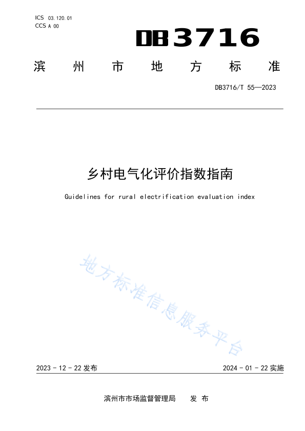 本文件提供了乡村电气化评价指数的基本原则、评价指数及权重、评价程序、评价计算、评价运用的指南。 本文件适用于滨州市乡村电气化的评价。