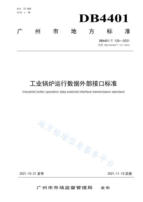 本文件按GB/T 1.1-2020 《标准化工作导则第1 部分:标准化文件的结构和起草规则》给出的规则进行编制。 本文件代替DBJ440100/T 217-2015《工业锅炉运行数据外部接口标准》,与DBJ440100/T 217-2015相比,除编辑性修改外,主要技术变化如下: 修改了表5锅炉数据采集终端需要采集的数据及存储位置,完善了参数名称: -补充修改了术语和定义: -修改了附录A格式。 本文件由广州市市场监督管理局提出并归口。 本文件负责起草单位:广州特种承压设备检测研究院。 本文件主要起草人:洪文健、李茂东、杨波、上官斌、罗健刚、张振顶、林金梅、毛力、阮心、李仕平 本文件所代替标准的历次版本发布情况为: DBJ440100/T 217-2015.