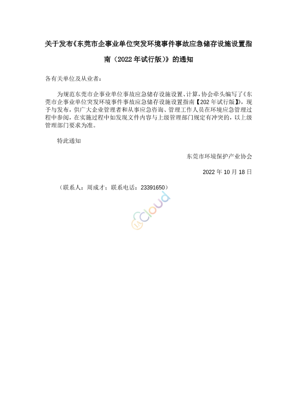 各有关单位及从业者: 为规范东莞市企事业单位事故应急储存设施设置、计算,协会牵头编写了《东莞市企事业单位突发环境事件事故应急储存设施设置指南【202年试行版】》,现予与发布,供广大企业管理者和从事应急咨询、管理工作人员在环境应急管理过程中参阅,在实施过程中如发现文件内容与上级管理部门规定有冲突的,以上级管理部门要求为准。 特此通知 东莞市环境保护产业协会 2022年10月18日