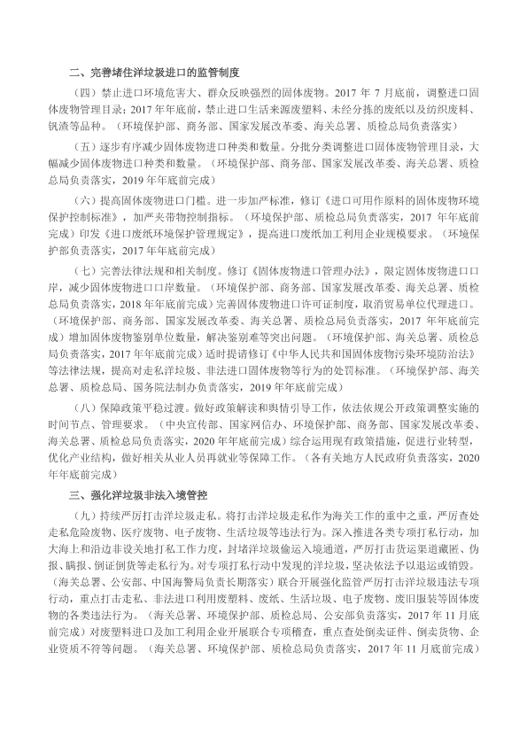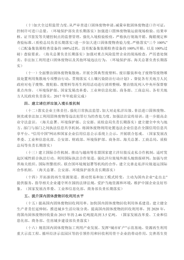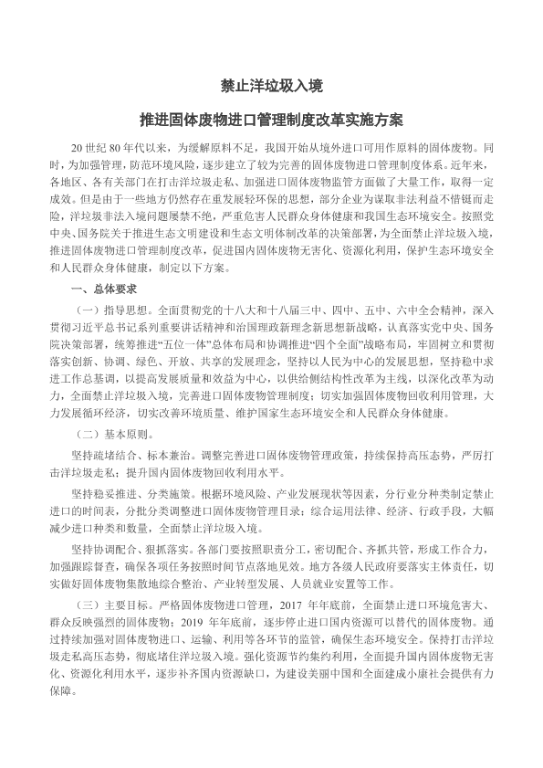 各省、自治区、直辖市人民政府,国务院各部委、各直属机构: 《禁止洋垃圾入境推进固体废物进口管理制度改革实施方案》已经国务院同意,现印发给你们,请认真贯彻执行。 国务院办公厅 2017年7月18日