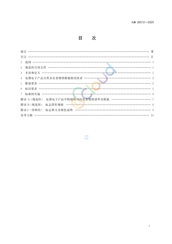 本文件按照GB/T1.1—2020《标准化工作导则第1部分:标准化文件的结构和起草规则》的规定起草。 本 文件代替GB/T26572—2011《电子电气产品中限用物质的限量要求》及其第1号修改单,与GB/T26572—2011相比,除结构调整和编辑性改动外,主要技术变化如下: a) 删除了“限用物质”术语和定义(见2011年版的3.1); b) 增加了“有害物质”“环保使用期限”“电器电子产品有害物质限制使用达标管理目录”和“应用例外”4个术语和定义(见3.2、3.6、3.7和3.8); c) 增加了电器电子产品分类及有害物质限制使用要求(见第4章); d) 增加了标识要求(见第6章); e) 删除了电子电气产品拆分(见2011年版的附录A)。 请注意本文件的某些内容可能涉及专利。本文件的发布机构不承担识别专利的责任。 本文件由中华人民共和国工业和信息化部提出并归口。 本文件及其所代替文件的历次版本发布情况为: ———2011年首次发布为GB/T26572—2011; ———本次为第一次修订。