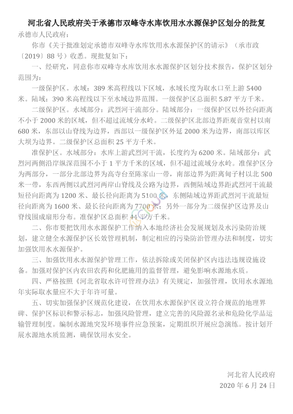 承德市人民政府: 你市《关于批准划定承德市双峰寺水库饮用水水源保护区的请示》(承市政〔2019〕88号)收悉。现批复如下: