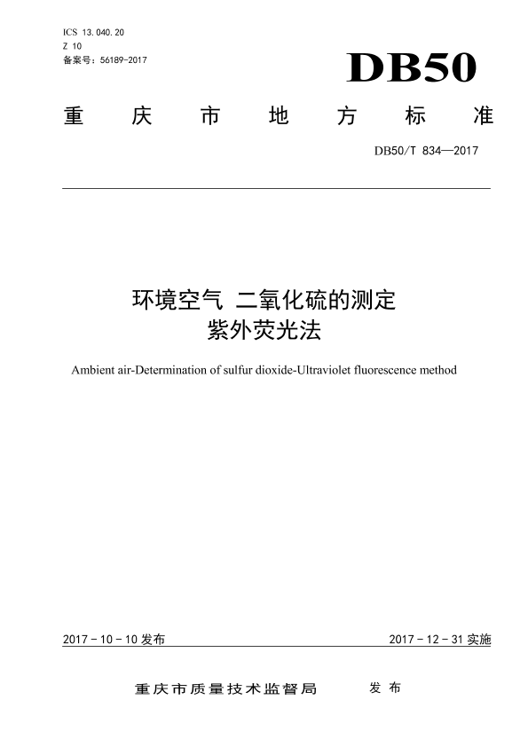 本标准规定了测定环境空气中二氧化硫的紫外荧光法。 本标准依据 GB/T 1.1-2009 和 HJ 168-2010 规则编制。 本标准为推荐性标准。 本标准为首次发布。 本标准由重庆市环境保护局提出并归口。 本标准起草单位:重庆市环境监测中心。 本标准主要起草人:胡勇,冯永超,龚玲,彭逸,王海波,胡霞,余轶松,金典,熊强,张君。 本标准验证单位:重庆市沙坪坝区环境监测站、重庆市万州区环境监测站、重庆市永川区环境监测站、重庆市涪陵区环境监测站、重庆市长寿区环境监测站、重庆市双桥区环境监测站。 本标准由重庆市人民政府于 20□□年□□月□□日批准。 本标准自 20□□年□□月□□日起实施。