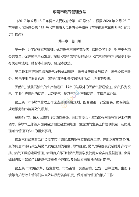 2017年6月15日东莞市人民政府令第147号公布,根据2020年2月25日东莞市人民政府令第155号《东莞市人民政府关于修改〈东莞市燃气管理办法〉的决定》修改