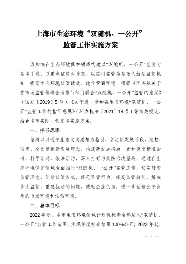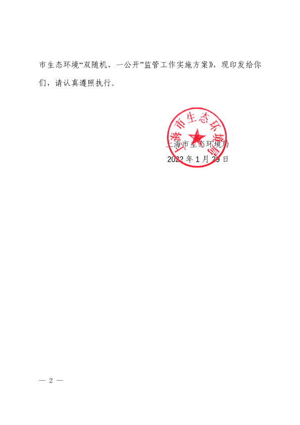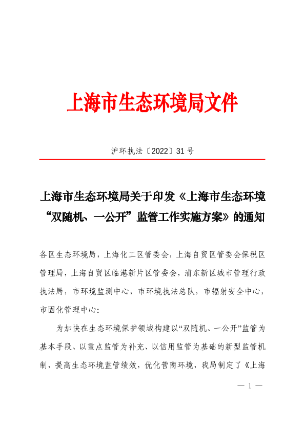 各区生态环境局,上海化工区管委会,上海自贸区管委会保税区管理局,上海自贸区临港新片区管委会,浦东新区城市管理行政执法局,市环境监测中心,市环境执法总队,市辐射安全中心,市固化管理中心: 为加快在生态环境保护领域构建以“双随机、一公开”监管为基本手段、以重点监管为补充、以信用监管为基础的新型监管机制,提高生态环境监管绩效,优化营商环境,我局制定了《上海市生态环境“双随机、一公开”监管工作实施方案》,现印发给你们,请认真遵照执行。