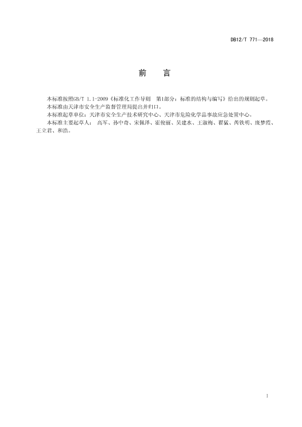 本标准按照GB/T 1.1-2009《标准化工作导则 第1部分:标准的结构与编写》给出的规则起草。 本标准由天津市安全生产监督管理局提出并归口。 本标准起草单位:天津市安全生产技术研究中心、天津市危险化学品事故应急处置中心。 本标准主要起草人: 高军、孙中奇、宋佩泽、霍俊丽、吴建水、王淑梅、翟猛、芮铁明、庞梦霞、王立君、和浩。