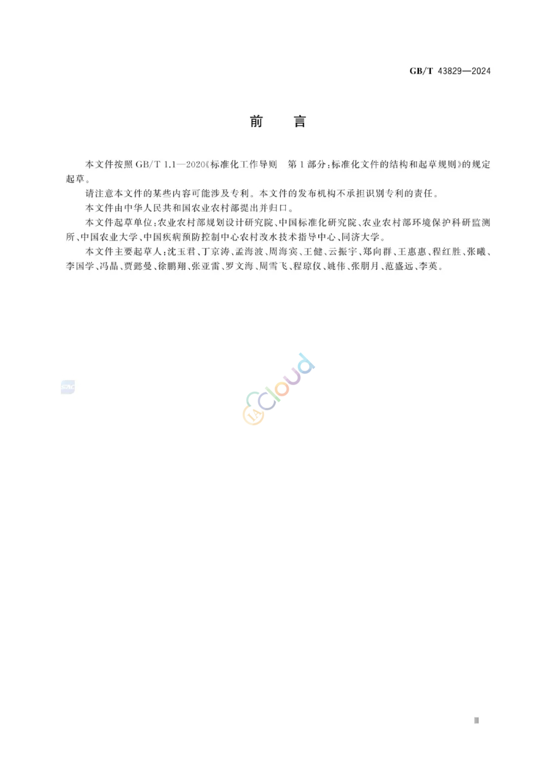 本文件按照GB/T1.1-2020《标准化工作导则第1部分:标准化文件的结构和起草规则》的规定起草。 请注意本文件的某些内容可能涉及专利。本文件的发布机构不承担识别专利的责任。 本文件由中华人民共和国农业农村部提出并归口。 本文件起草单位:农业农村部规划设计研究院、中国标准化研究院、农业农村部环境保护科研监测所.中国农业大学、中国疾病预防控制中心农村改水技术指导中心、同济大学。 本文件主要起草人:沈玉君、丁京涛、孟海波、周海宾、王健、云振宇、郑向群、王惠惠、程红胜、张曦、李国学、冯晶、贾懿曼、徐鹏翔、张亚雷、罗文海、周雪飞、程琼仪、姚伟、张朋月、范盛远、李英。