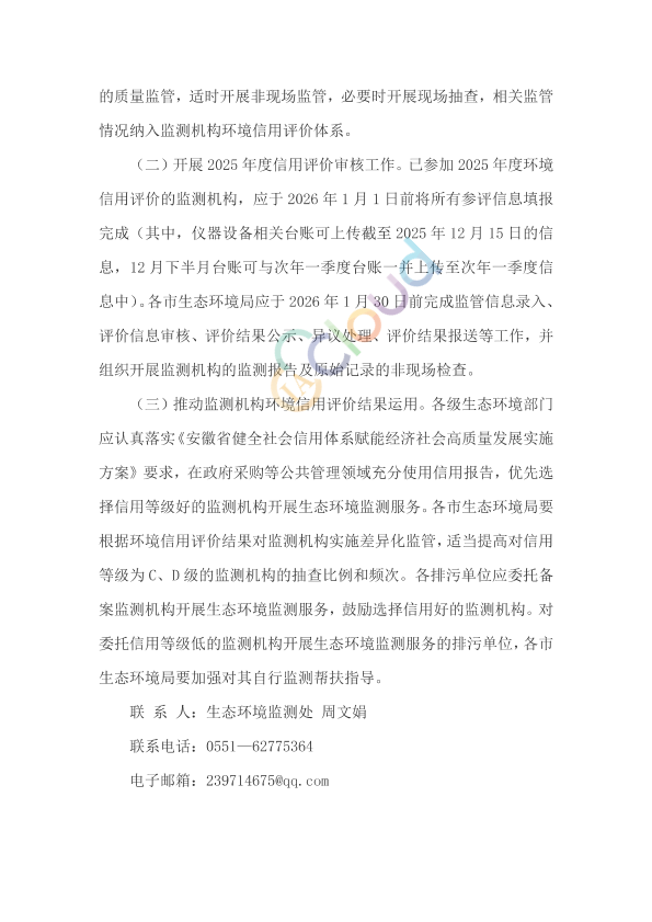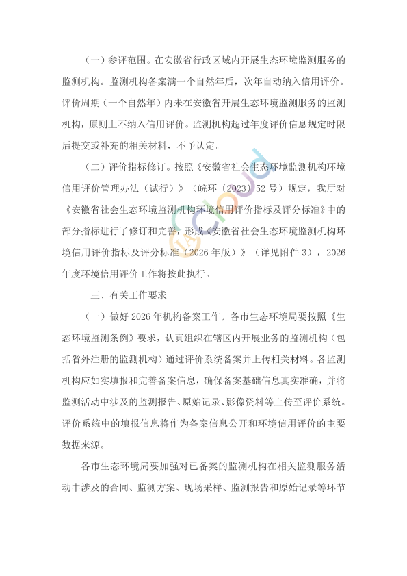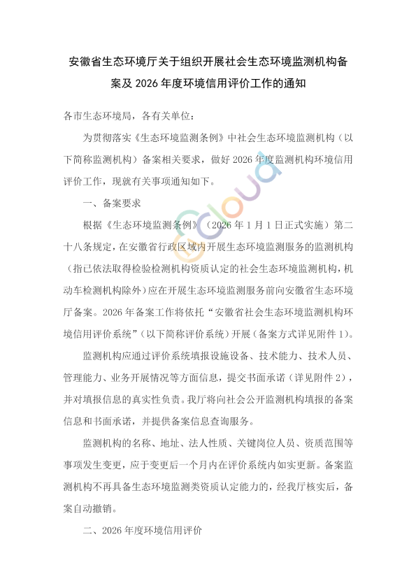各市生态环境局,各有关单位: 为贯彻落实《生态环境监测条例》中社会生态环境监测机构(以下简称监测机构)备案相关要求,做好2026年度监测机构环境信用评价工作,现就有关事项通知如下。