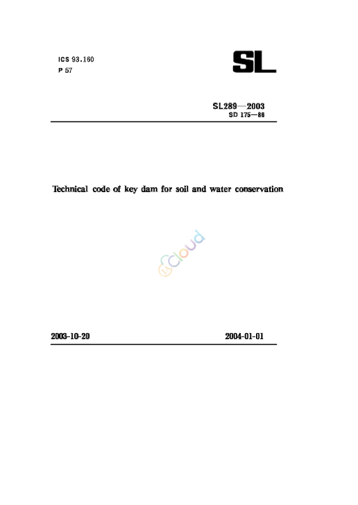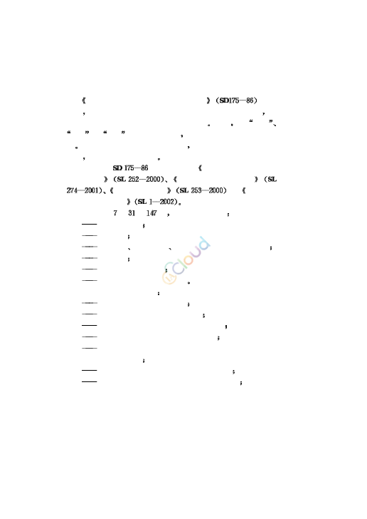 《水土保持治沟骨干工程暂行技术规范》(SD175--86) 颁布以来,对水土保持治沟骨干工程建设起到了积极的推动作用,这期间黄河流域修建了一千五百多座骨干坝。同时,在“七五”、“八五”和“九五”国家科研项目中,对骨干坝建设进行了专题攻关。为反映这些实践经验和技术成果,适应大规模的骨干坝建设需要,对原规范进行了修订。 本次修订SD 175--86的主要依据为《水利水电工程等级划分及洪水标准》(SL 252- -2000)、 《碾压式土石坝设计规范》(SL274- 2001)、 《溢洪道设计规范》(SL 253- 2000) 和《水利水电 技术标准编写规定》(SL 1- -2002)。 本规范共7章31节147条,主要技术内容有: -坝系工程布设; -水文计算; -土坝设计、溢洪道设计、放水工程设计和配套加固设计; -工程施工; -工程质量检查及验收; -工程管理等基本规定和要求。 本次修订的主要内容有: -增加了坝系工程布设的要求; -增加了配套加固工程设计的内容; -对单坝控制面积按侵蚀强度进行了区分; -规定了骨干坝设计条件和建筑物级别; -增加了洪水调查法推算设计洪峰流量及采用经验公式推算设计洪水总量的内容; -增加了坝体渗流计算和沉降量计算的方法; -增加了放水建筑物挑流消能水力计算等内容; -稳定计算规定以计及条块间作用力的方法为主; -稳定计算的安全 系数按照正常和非常两种运用条件确定,增加了规范的条文说明。 本规范1.0.6~ 1.0.10、5.1.3、5.2.1 ~ 5.2.3. 5.10.1 ~5.10.5、6.2.4、7.1.1、7.4.2~7.4.4为强制性条文,规范文本中用黑体字表示。 本规范所替代标准的历次版本为: SD175- 86 本规范批准部门:中华人民共和国水利部 本规范主持机构:水利部水士保持司 本规范解释单位:水利部水土保持司 本规范主编单位:水利部水土保持司 黄河上中游管理局 本规范出版、发行单位:中国水利水电出版社 本规范主要起草人:周月鲁 郑新民 薛顺康 王逸冰 蒋钢 梁其春 李靖 武哲 宋慧斌 曹丽玫 寇俊峰 王俊峰 王答相 王正杲 王庆阳 本规范审查会议技术负责人:焦居仁 本规范体例格式审查人。牟广承