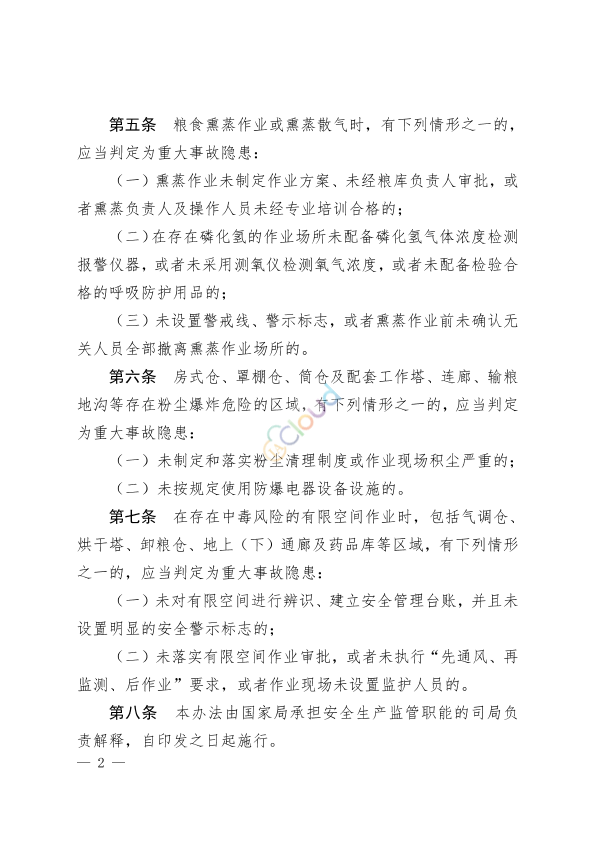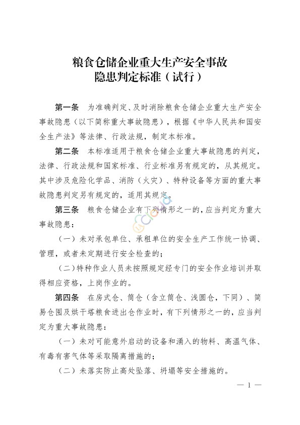 各省、自治区、直辖市及新疆生产建设兵团粮食和物资储备局(粮食局),中国储备粮管理集团有限公司、中粮集团有限公司、中国供销集团有限公司: 《粮食仓储企业重大生产安全事故隐患判定标准(试行)》,已经国家粮食和物资储备局局长办公会议审议通过,现印发给你们,请结合实际抓好落实。 国家粮食和物资储备局 2023年6月25日