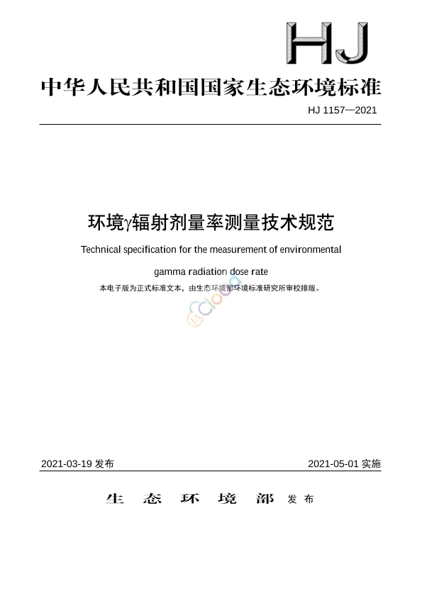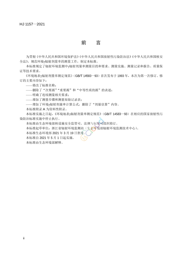 为贯彻《中华人民共和国环境保护法》《中华人民共和国放射性污染防治法》《中华人民共和国核安全法》,规范环境辐射剂量率的测量工作,制定本标准。 本标准规定了辐射环境监测中辐射剂量率测量目的和要求、测量实施、测量记录和报告、质量保证等技术要求。 《环境地表辐射剂量率测定规范》(GB/T 14583—93)首次发布于 1993 年,本次为第一次修订。修订的主要内容如下: ——修改了标准名称; ——删除了“次要源”“重要源”和“中等性质的源”的表述; ——明确了连续测量相关要求; ——增加了测量步骤和测量原始记录表; ——增加了环境辐射剂量率计算公式,删除了“剂量估算"内容。 本标准附录 A 为资料性附录。 本标准实施之日起,《环境地表辐射剂量率测定规范》(GB/T 14583—93)在相应的国家放射性污染防治标准实施中停止执行。 本标准由生态环境部核设施安全监管司、法规与标准司组织修订。 本标准起草单位:浙江省辐射环境监测站(生态环境部辐射环境监测技术中心)。 本标准生态环境部 2021 年 3 月 19 日批准。 本标准自 2021 年 5 月 1 日起实施。 本标准由生态环境部解释。