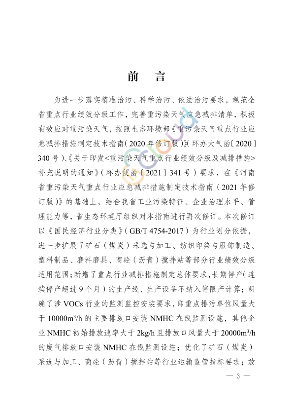 各省辖市、济源示范区生态环境局,郑州航空港经济综合实验区生态环境和城市管理局(综合行政执法局): 为进一步落实精准治污、科学治污、依法治污要求,规范全省重点行业绩效分级工作,完善重污染天气应急减排清单,积极有效应对重污染天气,省生态环境厅修订了《河南省重污染天气重点行业应急减排措施制定技术指南(2024年修订版)》《河南省重污染天气通用行业应急减排措施制定技术指南(2024年修订版)》,现印发实施。自本文件印发之日起,《河南省重污染天气重点行业应急减排措施制定技术指南(2021年修订版)》《河南省重污染天气通用行业应急减排措施制定技术指南(2021年修订版)》废止。 附件1 河南省重污染天气重点行业应急减排措施制定技术指南(2024年修订版) 附件2 河南省重污染天气通用行业应急减排措施制定技术指南(2024年修订版) 2024年11月14日 主办:大气环境处 督办:大气环境处 河南省生态环境厅办公室 2024年11月14日印发