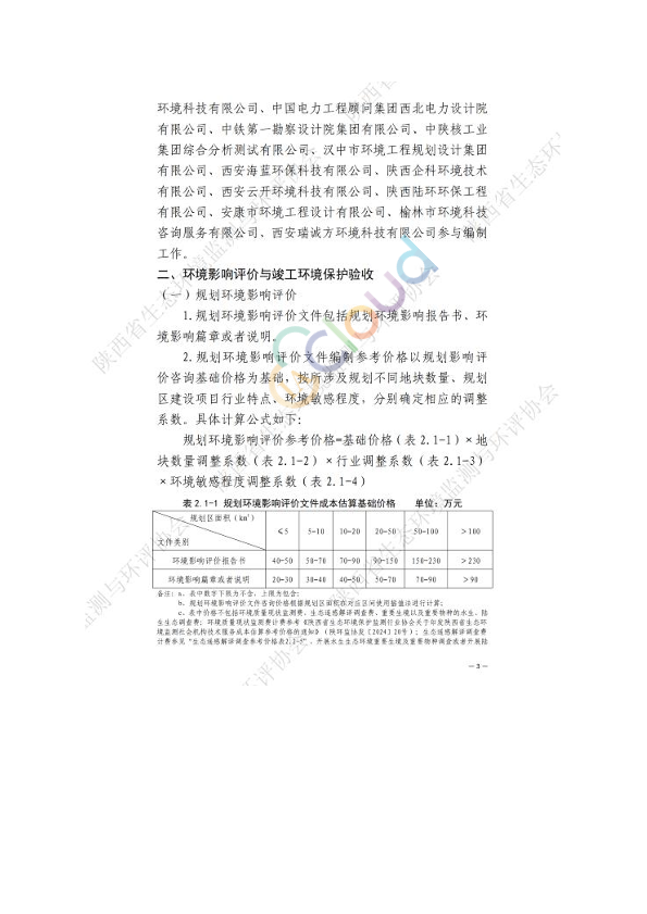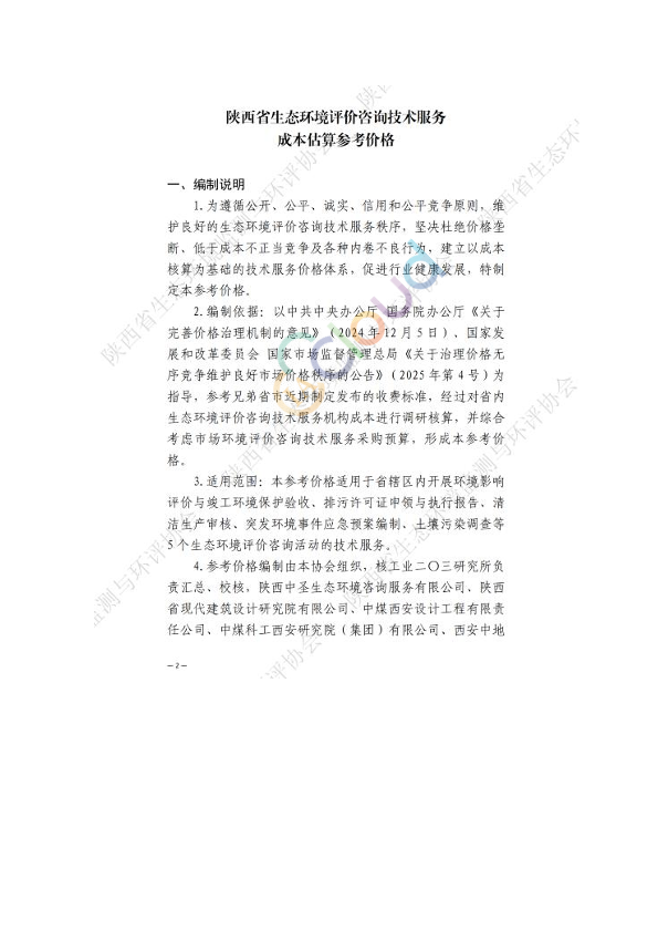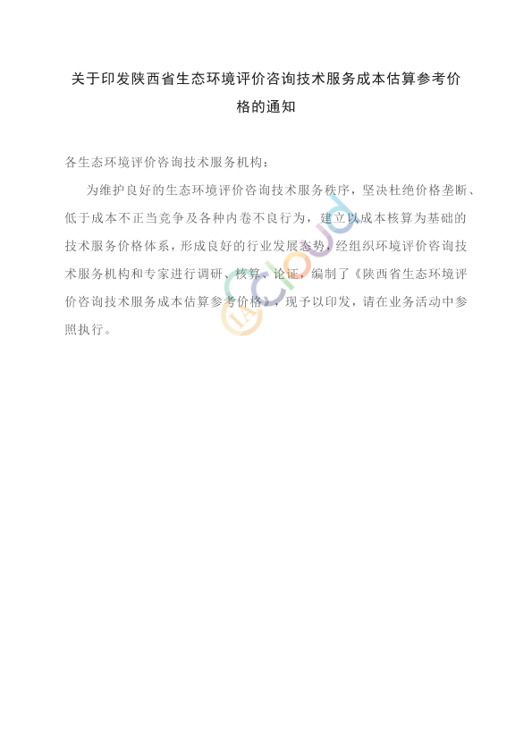 各生态环境评价咨询技术服务机构: 为维护良好的生态环境评价咨询技术服务秩序,坚决杜绝价格垄断、低于成本不正当竞争及各种内卷不良行为,建立以成本核算为基础的技术服务价格体系,形成良好的行业发展态势,经组织环境评价咨询技术服务机构和专家进行调研、核算、论证,编制了《陕西省生态环境评价咨询技术服务成本估算参考价格》,现予以印发,请在业务活动中参照执行。