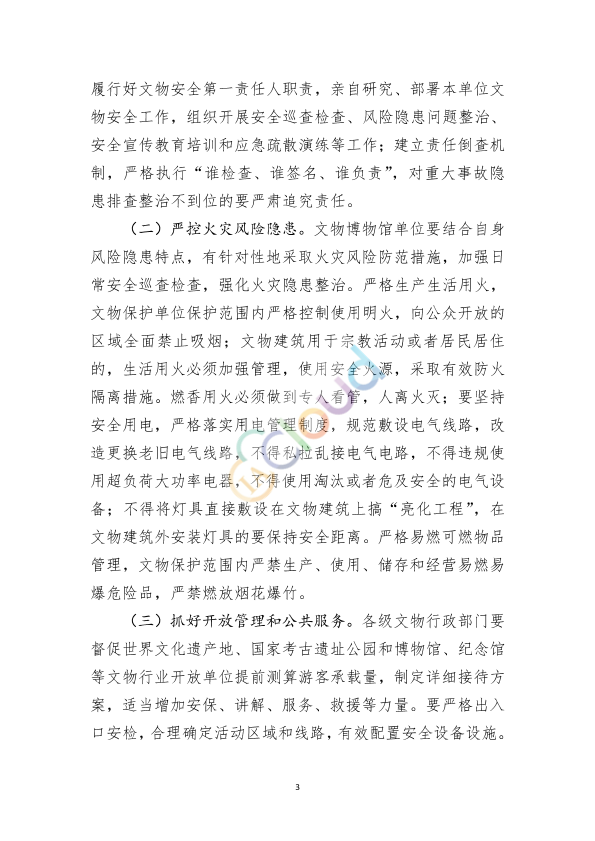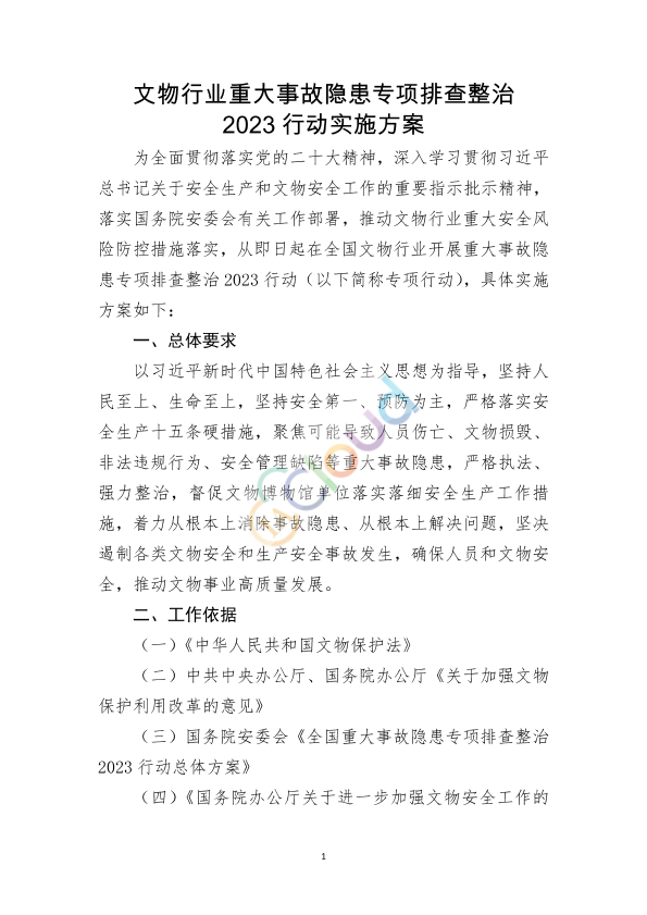 各省、自治区、直辖市文物局(文化和旅游厅/局),新疆生产建设兵团文物局: 为全面贯彻落实党的二十大精神,深入学习贯彻习近平总书记关于安全生产和文物安全工作的重要指示批示精神,落实国务院安委会有关工作部署,推动文物行业重大安全风险防控措施落实,从即日起在全国文物行业开展重大事故隐患专项排查整治2023行动。现将《文物行业重大事故隐患专项排查整治2023行动实施方案》印发给你们,请结合本地实际,认真组织实施。 特此通知。 附件下载: 附件:文物行业重大事故隐患专项排查整治2023行动实施方案 国家文物局 2023年5月5日