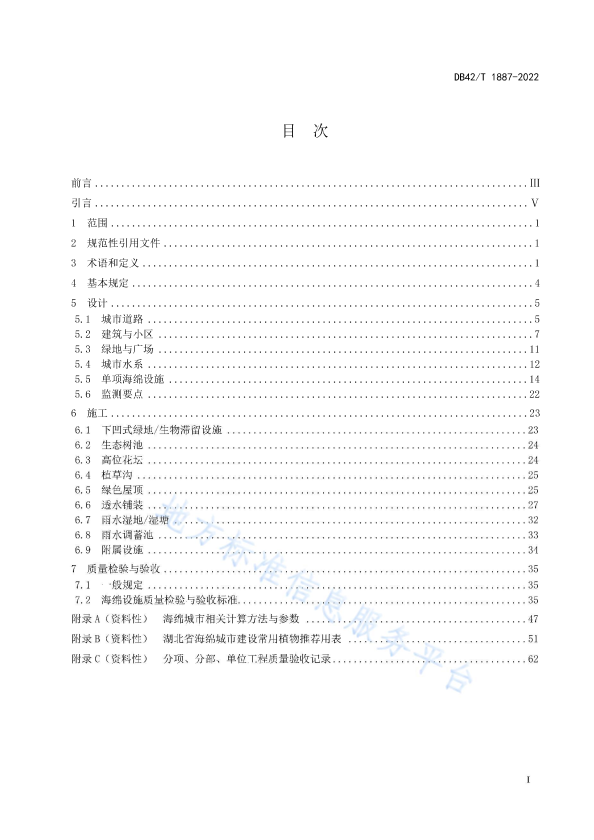 本文件按照 GB/T 1.1-2020《标准化工作导则 第 1 部分:标准化文件的结构和起草规则》给出的规则起草。 本文件由湖北省住房和城乡建设厅提出并归口管理。 本文件起草单位:武汉市政工程设计研究院有限责任公司、中南建筑设计院股份有限公司、湖北省水利水电规划勘测设计院、武汉武钢绿色城市技术发展有限公司、武汉市海绵城市和综合管廊建设管理站、中信建筑设计研究总院有限公司、武汉绿风科技工程有限公司、武汉长江环境工程有限公司、上海沪望建筑科技发展有限公司。 本文件主要起草人:吕锦刚、饶世雄、毛毅、李小风、石亚军、康丹、李静、李娜、曹利勇、蔡晓萌、李明、位文强、魏征、梁发、李尔、许银行、盛祥雪、邓波、肖峰、庄伟、温志宇、江山、范乐、宋必伟、张守城、李传志、梁瑾、曾晨、侯冰冰、张辉、黄云海、牟林森、郭亚琼、杨育清。 本文件实施应用中的疑问,可咨询湖北省住房和城乡建设厅,联系电话:027-68873088,邮箱:mail.hbszjt.net.cn。在执行过程中如有意见和建议请邮寄武汉市政工程设计研究院有限责任公司(地址:武汉市汉口常青路 40 号,邮编:430023,电话:027-85603515)。