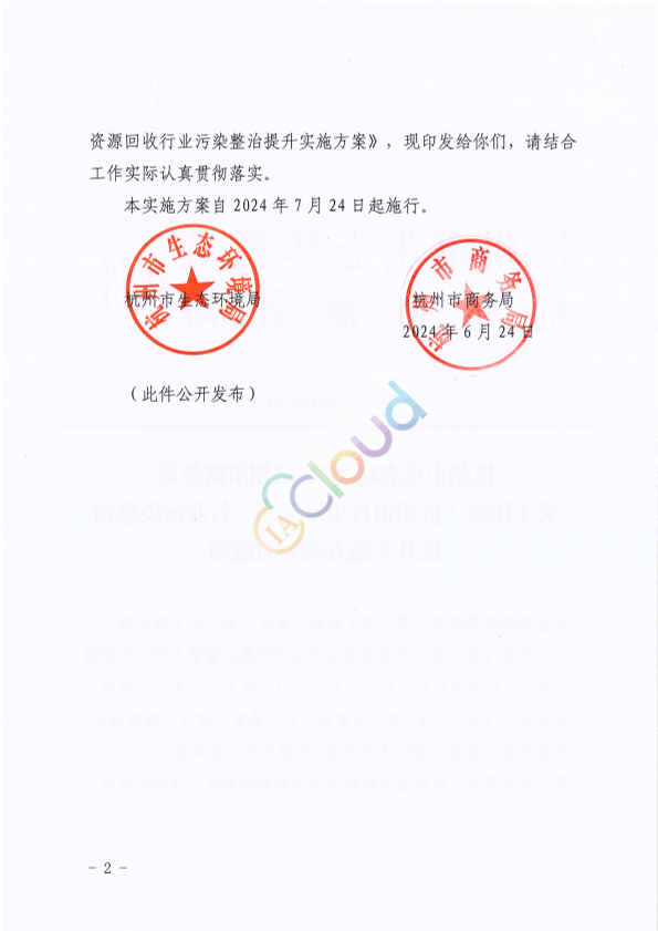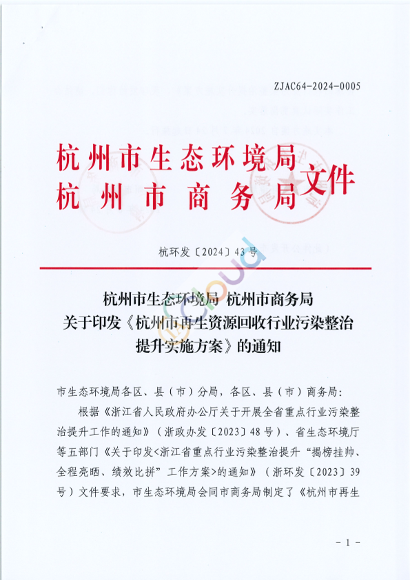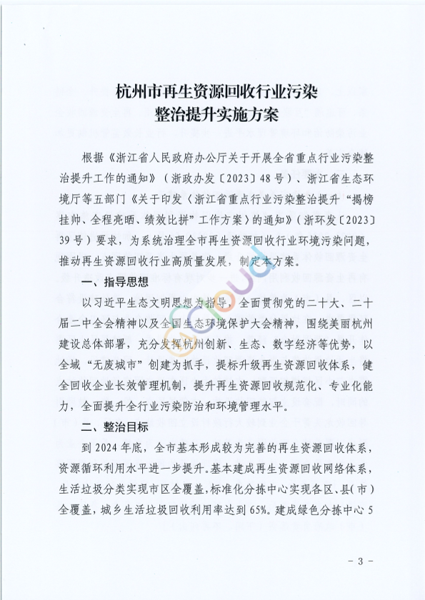 市生态环境局各区、县(市)分局,各区、县(市)商务局: 根据《浙江省人民政府办公厅关于开展全省重点行业污染整治提升工作的通知》(浙政办发〔2023〕48号)、省生态环境厅等五部门《关于印发的通知》(浙环发〔2023〕39号)文件要求,市生态环境局会同市商务局制定了《杭州市再生资源回收行业污染整治提升实施方案》,现印发给你们,请结合工作实际认真贯彻落实。 本实施方案自2024年7月24日起施行。 杭州市生态环境局 杭州市商务局 2024年6月24日