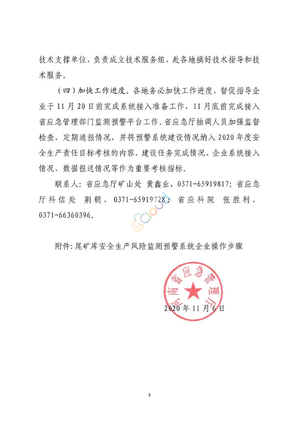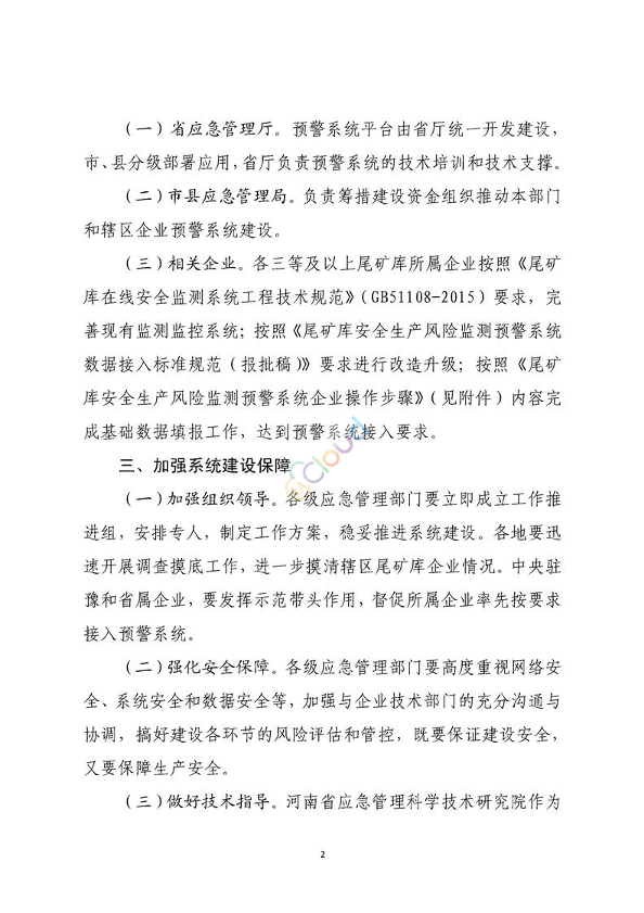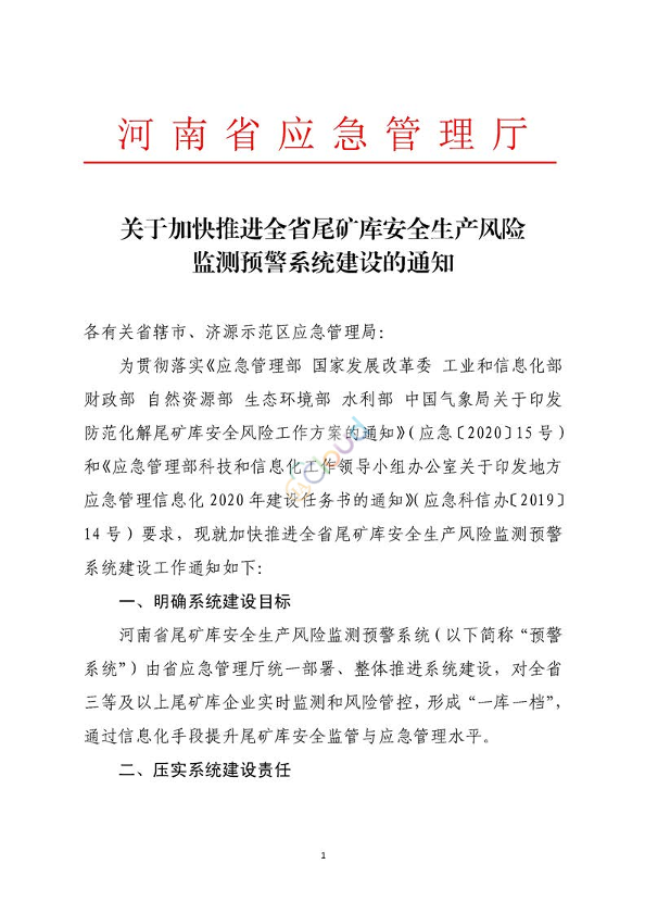 各有关省辖市、济源示范区应急管理局: 为贯彻落实《应急管理部国家发展改革委工业和信息化部财政部自然资源部 生态环境部 水利部 中国气象局关于印发防范化解尾矿库安全风险工作方案的通知》(应急[2020]15号)和《应急管理部科技和信息化工作领导小组办公室关于印发地方应急管理信息化2020年建设任务书的通知》(应急科信办[2019]14号)要求,现就加快推进全省尾矿库安全生产风险监测预警系统建设工作通知如下: