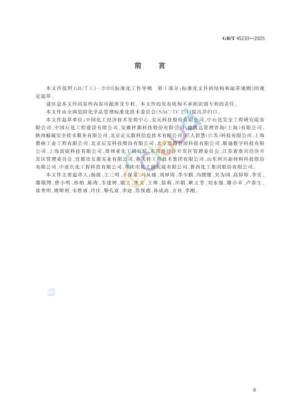 本文件按照 GB/T 1.1—2020《标准化工作导则 第 1 部分:标准化文件的结构和起草规则》的规定起草。 请注意本文件的某些内容可能涉及专利。本文件的发布机构不承担识别专利的责任。 本文件由全国危险化学品管理标准化技术委员会(SAC/TC 251)提出并归口。 本文件起草单位:中国化工经济技术发展中心、安元科技股份有限公司、中石化安全工程研究院有限公司、中国石化工程建设有限公司、安徽祥源科技股份有限公司、德凯达管理咨询(上海)有限公司、陕西精诚安全技术服务有限公司、北京正元数科信息技术有限公司、匠人智慧(江苏)科技有限公司、上海爵格工业工程有限公司、北京辰安科技股份有限公司、北京思路智园科技有限公司、联通数字科技有限公司、上海富铤科技有限公司、贵州省化工研究院、东营港经济开发区管理委员会、江苏省泰兴经济开发区管理委员会、宜都市友源实业有限公司、赛飞特工程技术集团有限公司、山东利兴新材料科技股份有限公司、中蓝长化工程科技有限公司、重庆市化工研究院有限公司、鲁西化工集团股份有限公司。 本文件主要起草人:杨挺、王三明、辛保泉、马从越、刘厚周、李少鹏、冯媛媛、吴为国、高婷婷、李安、滕敬博、曾小明、孙柏、陈涛、韦建树、谢立、张文、王帅、徐莉、田娟、耿立芳、刘永强、滕小幸、卢春生、徐秀明、姚顺利、朱胜勇、冷庆、黎孔富、李迪、苏强德、孙成高、方舟、李刚。