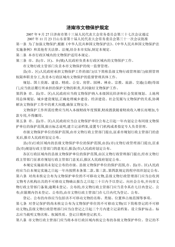 2007年9月27日济南市第十三届人民代表大会常务委员会第三十七次会议通过 2007年11月23日山东省第十届人民代表大会常务委员会第三十一次会议批准